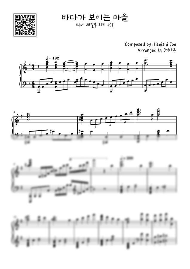 [마녀 배달부 키키 OST] 히사이시 조 - 바다가 보이는 마을 피아노 커버 + 악보