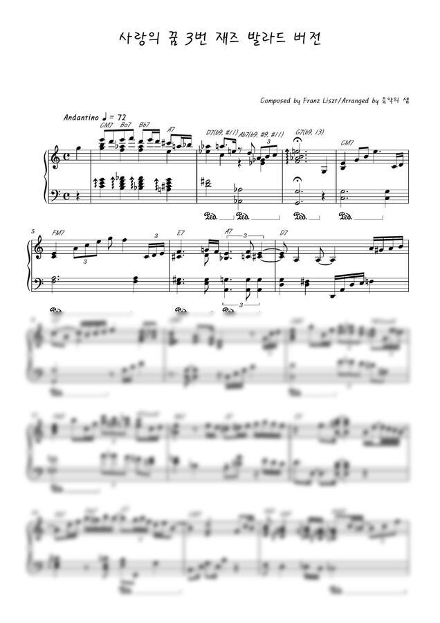 리스트 "사랑의 꿈 3번"을 재즈 발라드 피아노 독주곡 편곡버전입니다. 연주할 때 감성을 더 잘 살리기 위해 리듬을 루바토 스타일로 배치했습니다.