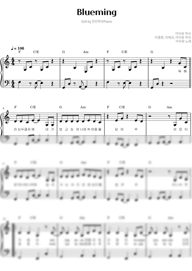 아이유(IU) - Blueming(C)[초급] (계이름,코드,가사)
