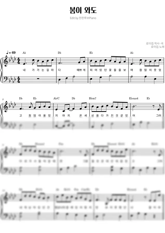 로이킴 - 봄이 와도(Ab-Bb)[초급] (계이름,코드,가사)