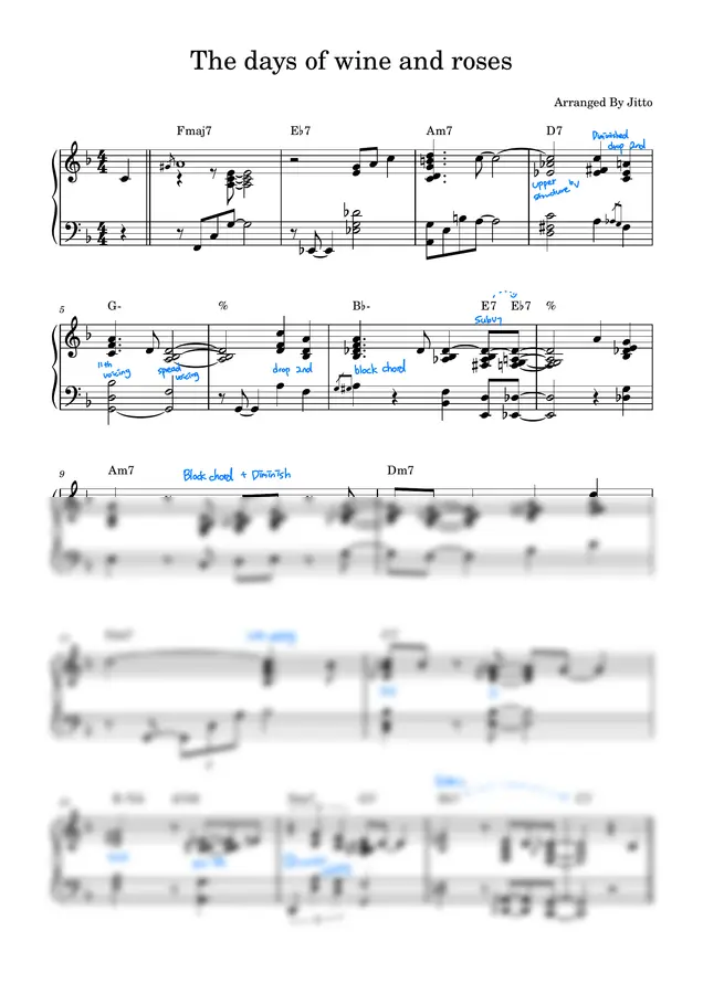 정말 유명한 재즈 스탠다드 곡인 The days of wine and roses를 다양한 재즈 보이싱과 여러 아이디어들을 넣어 재즈 발라드로 연주해보았습니다~! 사용된 보이싱과 여러 발라드 아이디어들에 대한 설명을 악보에 적어두었습니다!