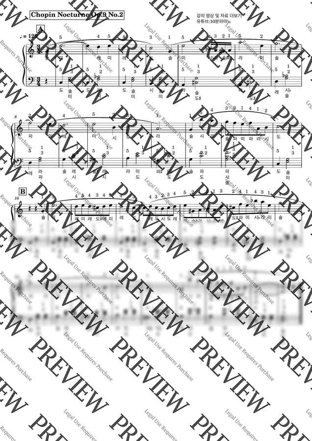쇼팽 녹턴 op9 no.2 쉬운 악보 초보,입문자용 계이름,손가락 번호 포함