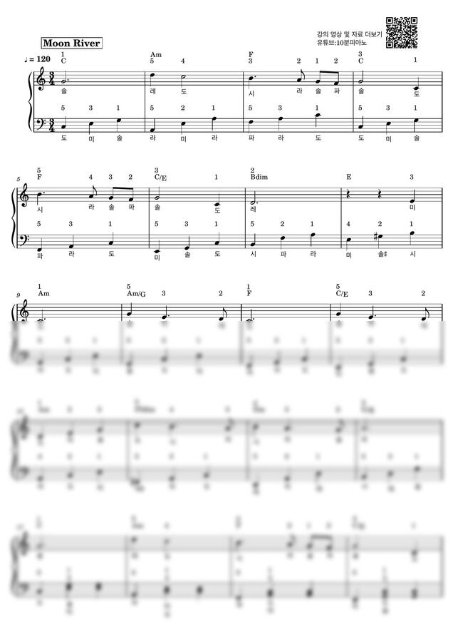 문리버(Moon River) 쉬운 악보 초보,입문자용 계이름,손가락 번호 포함
