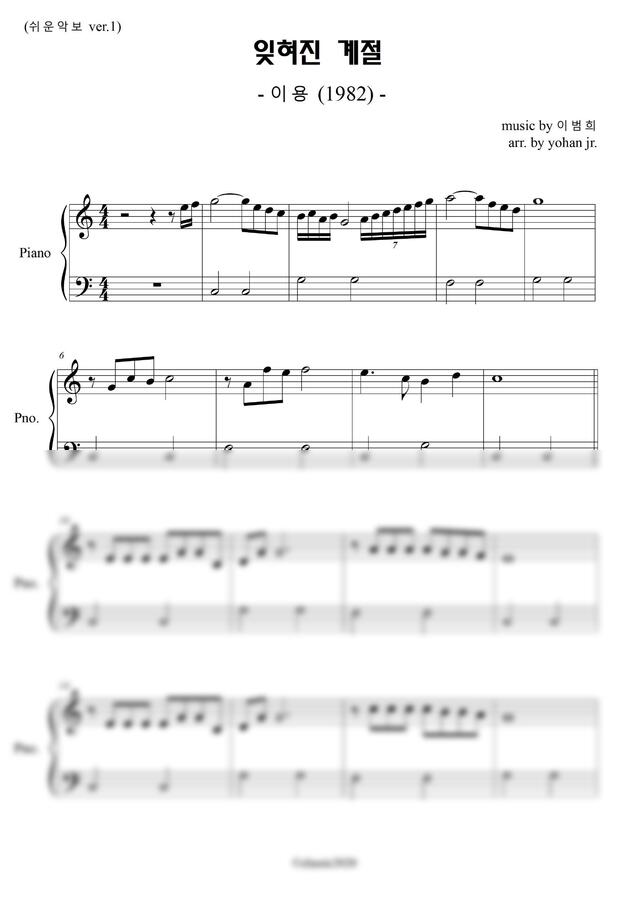 이용님의 '잊혀진 계절'을 피아노로 쉽게 칠 수 있도록 편곡한 악보입니다. 1980년대 노래이며 가사 내용때문에 10월 말에 많이 들을 수 있는 노래예요.