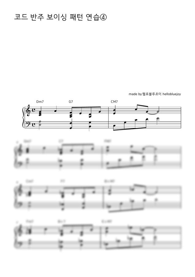 오늘은 코드 반주 보이싱 패턴 연습④ 악보를 만들어 보았습니다. 코드 반주 보이싱 패턴 연습하시고 싶은 분들께 추천드리는 악보입니다. 가요,pop, ccm,작곡 등 적용해서 연주가 가능합니다. 즐겁게 연습하세요.
