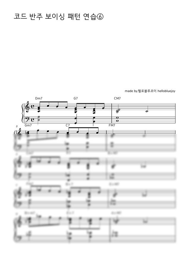 오늘은 코드 반주 보이싱 패턴 연습⑥ 악보를 만들어 보았습니다. 코드 반주 보이싱 패턴 연습하시고 싶은 분들께 추천드리는 악보입니다. 가요,pop, ccm,작곡 등 적용해서 연주가 가능합니다. 즐겁게 연습하세요.