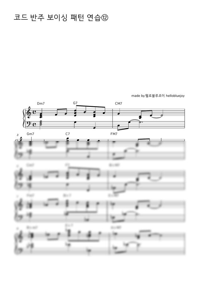 오늘은 코드 반주 보이싱 패턴 연습⑫ 악보를 만들어 보았습니다. 코드 반주 보이싱 패턴 연습하시고 싶은 분들께 추천드리는 악보입니다. 가요,pop, ccm,작곡 등 적용해서 연주가 가능합니다. 즐겁게 연습하세요.