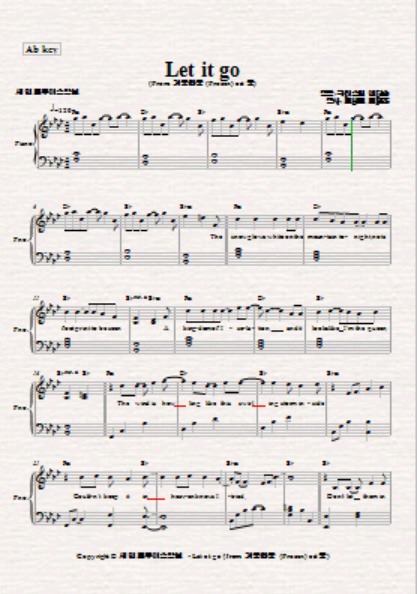 겨울왕국(Frozen) 중 가장 유명한 "Let it go" 원키인 Ab key 보컬멜로디+가사+반주 악보입니다