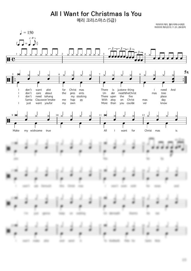 Mariah Carey(머라이어케리) - All I Want for Christmas Is You (캐롤)♩=150 활자큰드럼악보3P(악보2개) (보통드럼과정) by BK뮤직