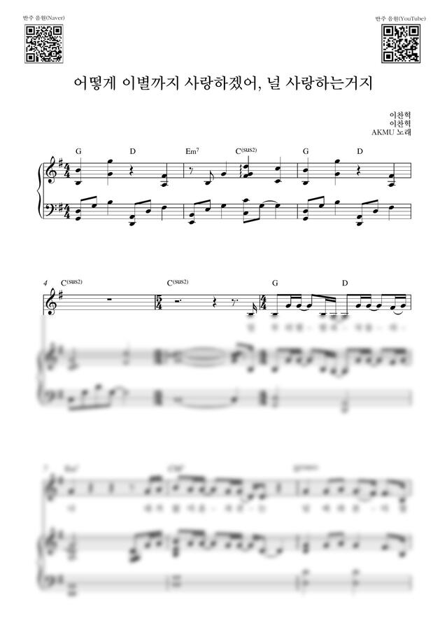 AKMU (악동뮤지션) - 어떻게 이별까지 사랑하겠어, 널 사랑하는거지_G Key (피아노 3단) by Samuel Park 1p 미리보기