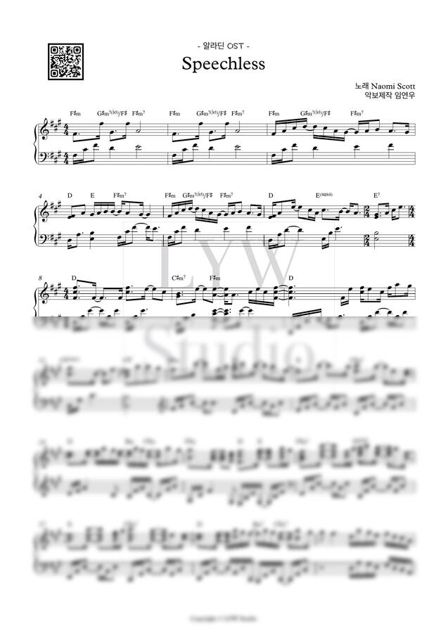 이번 곡은 'Speechless - 알라딘OST' 피아노 연주 악보입니다.