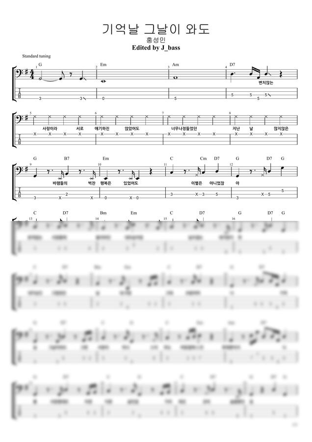 홍성민의 “기억날 그날이 와도“ 베이스기타 악보입니다.