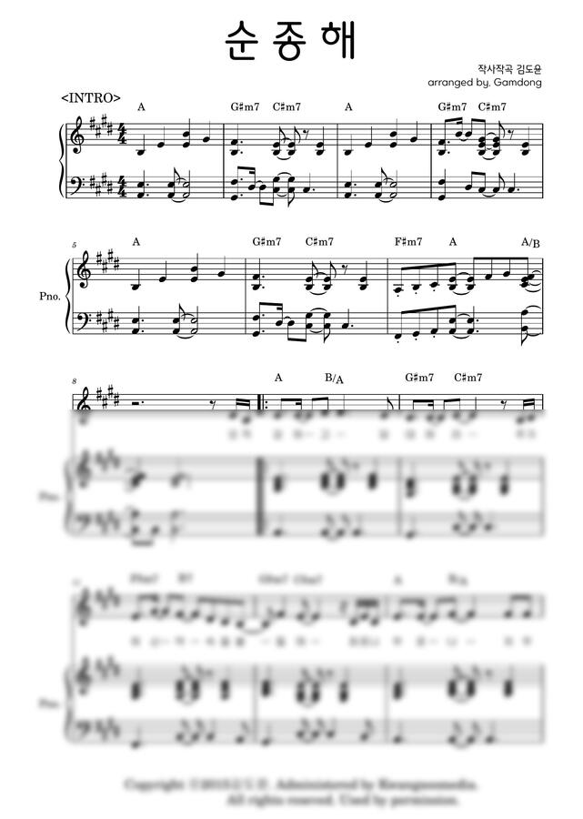 김도윤 - 순종해(온누리키즈벤처9집) (E키 3단 반주악보) by Gamdong