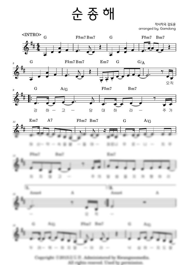 김도윤 - 순종해(온누리키즈벤처9집) (D키 멜로디악보) by Gamdong