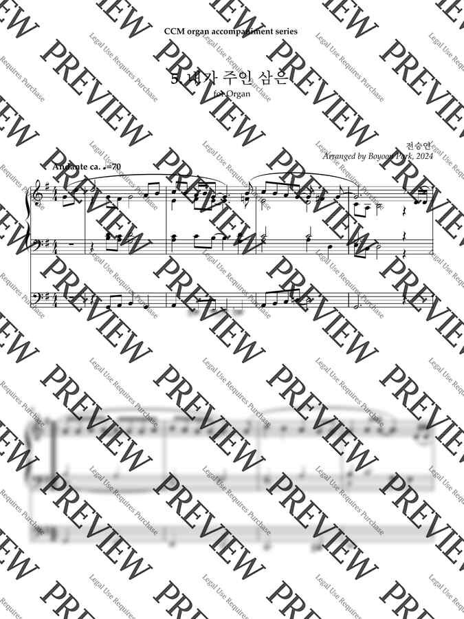 CCM accompaniment series의 다섯 번째 곡, <내가 주인삼은 모든 것>입니다. 이 시리즈의 다른 곡들과 마찬가지로, 짧은 전주와 두 절을 반주할 수 있도록 썼습니다. 한국 작곡가의 CCM 찬양곡은 가사와 선율에 우리 마음을 어루만지는 특별한 정서가 있어서 편곡을 할 때도 마음이 찡해질 때가 많습니다. 이 곡도 많은 것을 함께 생각할 수 있는 내용이 가득합니다. 이 곡은 전주곡이나 후주곡, 또는 연주곡으로도 써보고 싶은 곡입니다. 편곡하면서 제가 받은 감동이 이 곡을 반주하시는 분들에게도 전해졌으면 합니다.