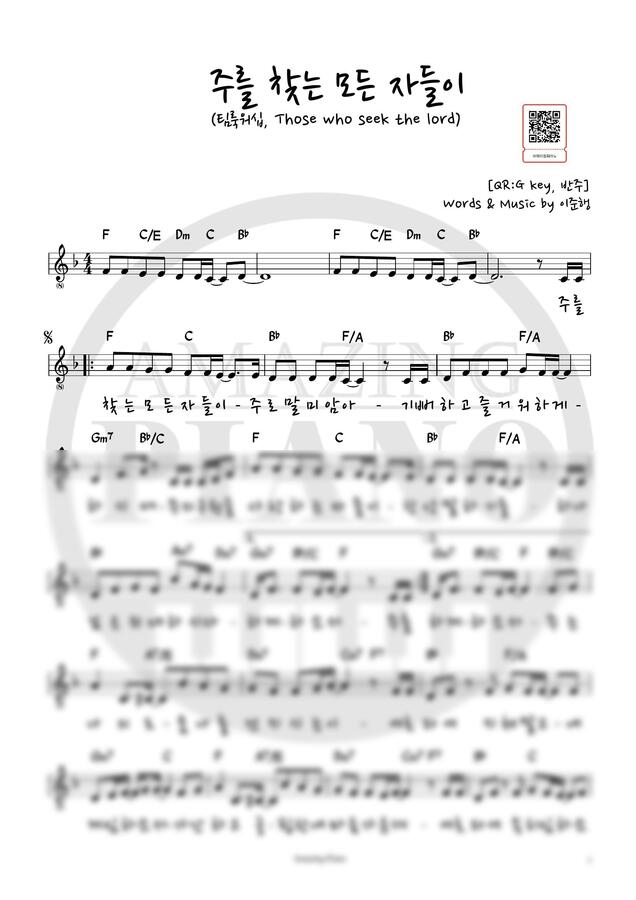 팀룩워십 - 주를 찾는 모든 자들이 (Fkey,단선) by 어메이징피아노