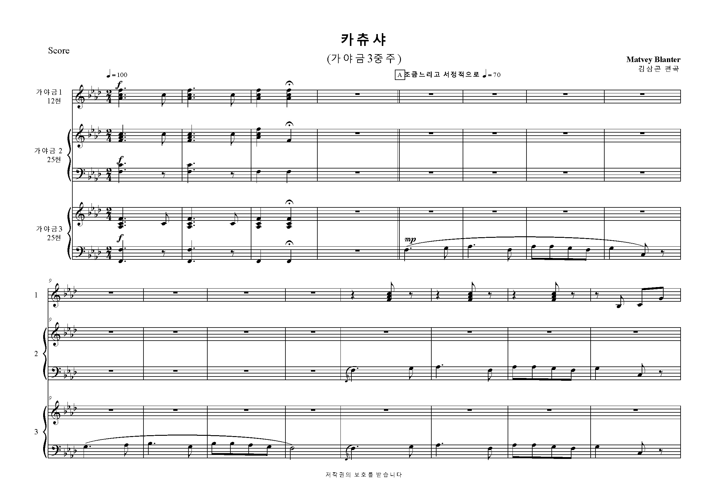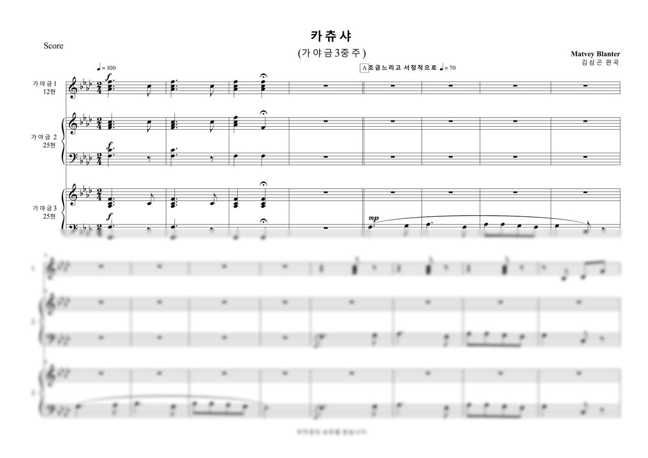 광주가야금연주단에 위촉받아 초연된 카츄샤는 1938년에 마트베이 블란테르가 작곡하고 미하일 이사콥스키가 작사한 러시아의 대표적인 민요이자 군가입니다. 제2차 세계대전 당시 군인들의 사기를 북돋우며 널리 사랑받았고, 현재까지도 러시아 국민들에게 널리 불리고 있습니다. 전쟁터에 나간 연인을 그리워하는 카츄샤의 애절한 마음을 담은 가사와 아름다운 멜로디가 특징입니다. 이 아름다운 곡은 한국의 전통 악기인 가야금 3중주로 편곡되어 새로운 매력을 선보였습니다. 한국적인 정서와 애잔함을 담은 가야금 선율은 카츄샤의 그리움을 더욱 깊이 있게 표현하며, 동양과 서양 음악의 아름다운 조화를 이루어냅니다. 이 편곡은 원곡의 감동을 고스란히 간직하면서도 한국 전통 음악의 멋을 더하여 색다른 감동을 선사합니다.