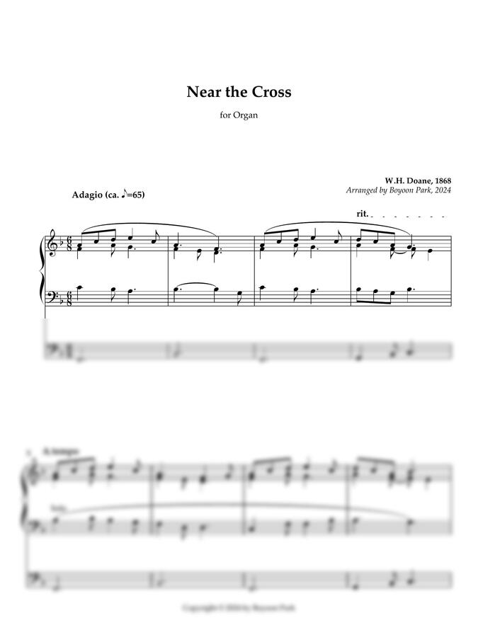 찬송 작시가 제인 크로스비와 함께 수많은 찬송선율을 남긴 윌리엄 하워드 돈(William H. Doane, 1832-1915)의 <Near the Cross>를 오르간 전주곡으로 바꾸어보았습니다. 이 곡은 예배 전주곡 뿐 아니라 성찬식 중에도 연주할 수 있어요. 템포는 너무 서두르지 마시되, 지나치게 늘어지지 않도록 주의하셔서 연주하시면 좋을 것 같습니다. 솔로 선율이 나올 때는 조용한 솔로스톱을 사용하시고, 반주부도 고요한 스톱 계열을 사용해주세요.