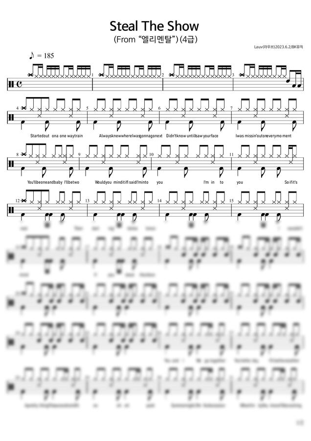 Lauv(리우브) - Steal The Show ♪=185(4급) 드럼악보2P