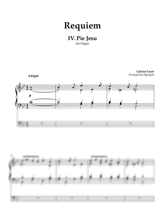 가브리엘 포레의 레퀴엠 중에서 네 번째 곡인 <Pie Jesu>를 오르간곡으로 편곡했어요. '자비로운 예수'란 제목의 이 곡은 원곡에서 참 아름다운 솔로곡입니다. 성악 솔로 부분을 함께 오르간으로 연주하도록 적었어요. 고요하고 차분한 분위기를 잘 살려서 연주하시면 감동이 많이 되는 곡입니다. 은혜 가득한 연주되시기를 바래요.