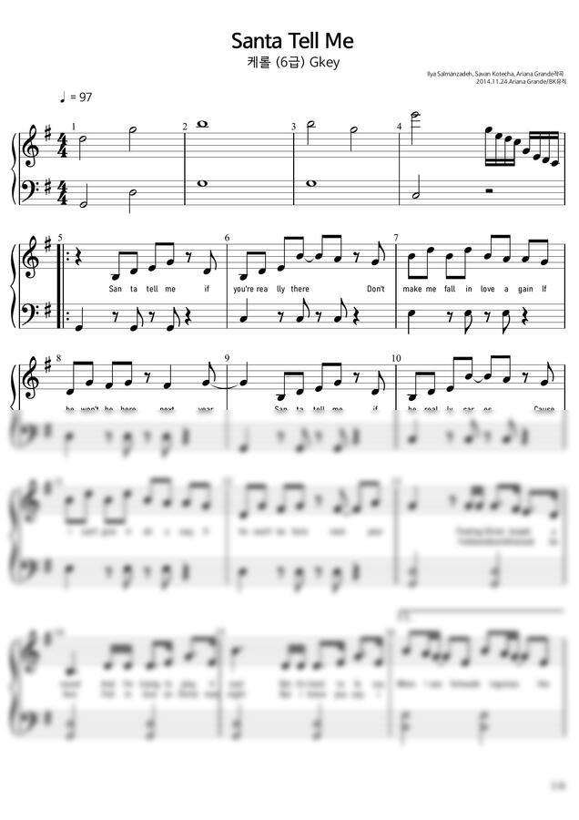 Ariana Grande(아리아나 그란데) - Santa Tell Me(산타텔미)(6급)Gkey활자큰3마디피아노악보4P(악보2개) (체르니30번과정케롤) by BK뮤직