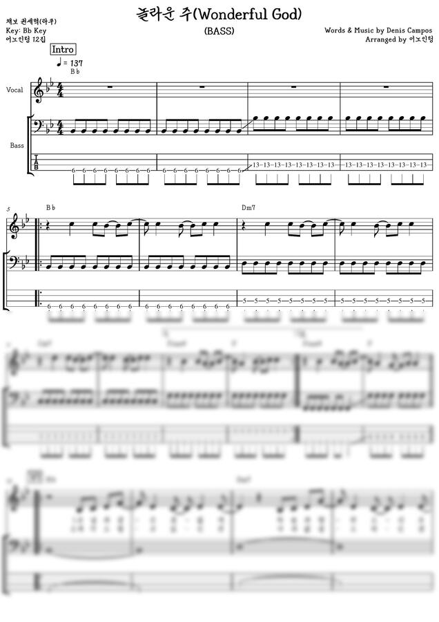 어노인팅(ANOINTING) 12집에 수록된 놀라운 주(Wonderful God)의 베이스 타브 악보를 채보해보았습니다.