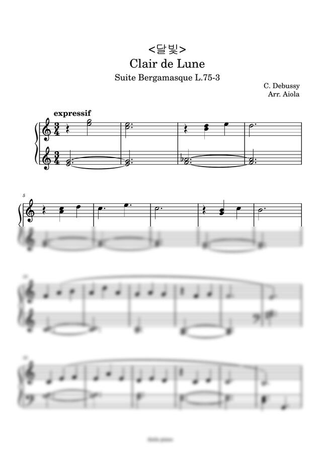 드뷔시 달빛을 C Major 키로 조표 없이, 박자표를 쉽게 변형해서 다시 만든악보에요:)