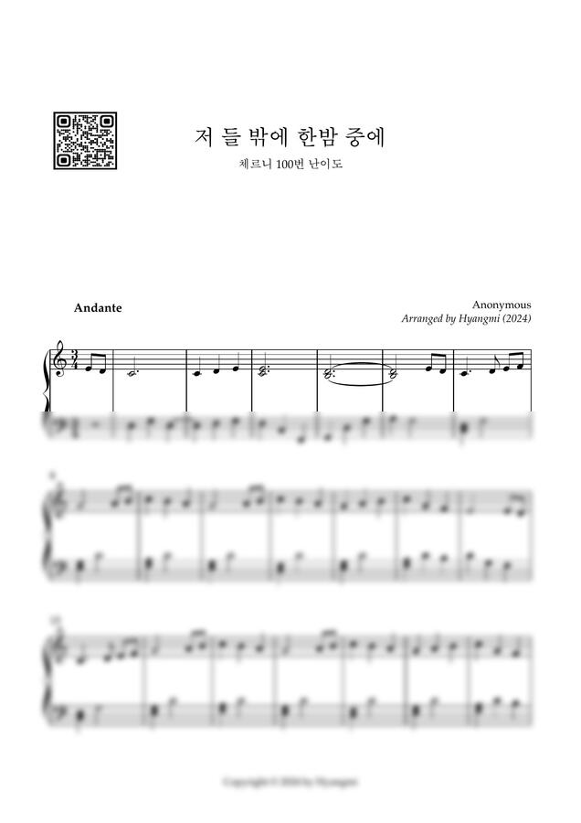 크리스마스 캐롤 <저 들 밖에 한밤 중에>를 피아노곡으로 연주할 수 있도록 편곡했어요. 체르니 100번 난이도의 곡이고, 눈 내리는 차분하고 평온한 크리스마스 분위기를 느끼며 연주하실 수 있을 거예요. 즐겁게 연주하세요!