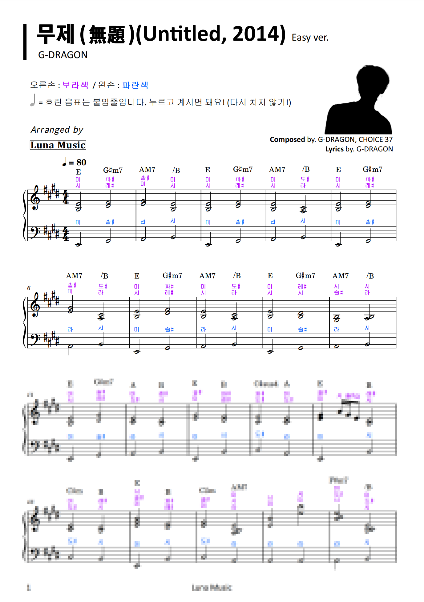 G-DRAGON (지드래곤) - 무제 (無題) (Untitled) [쉬운 원곡 반주악보] (계이름 악보) by 루나뮤직 Easy0