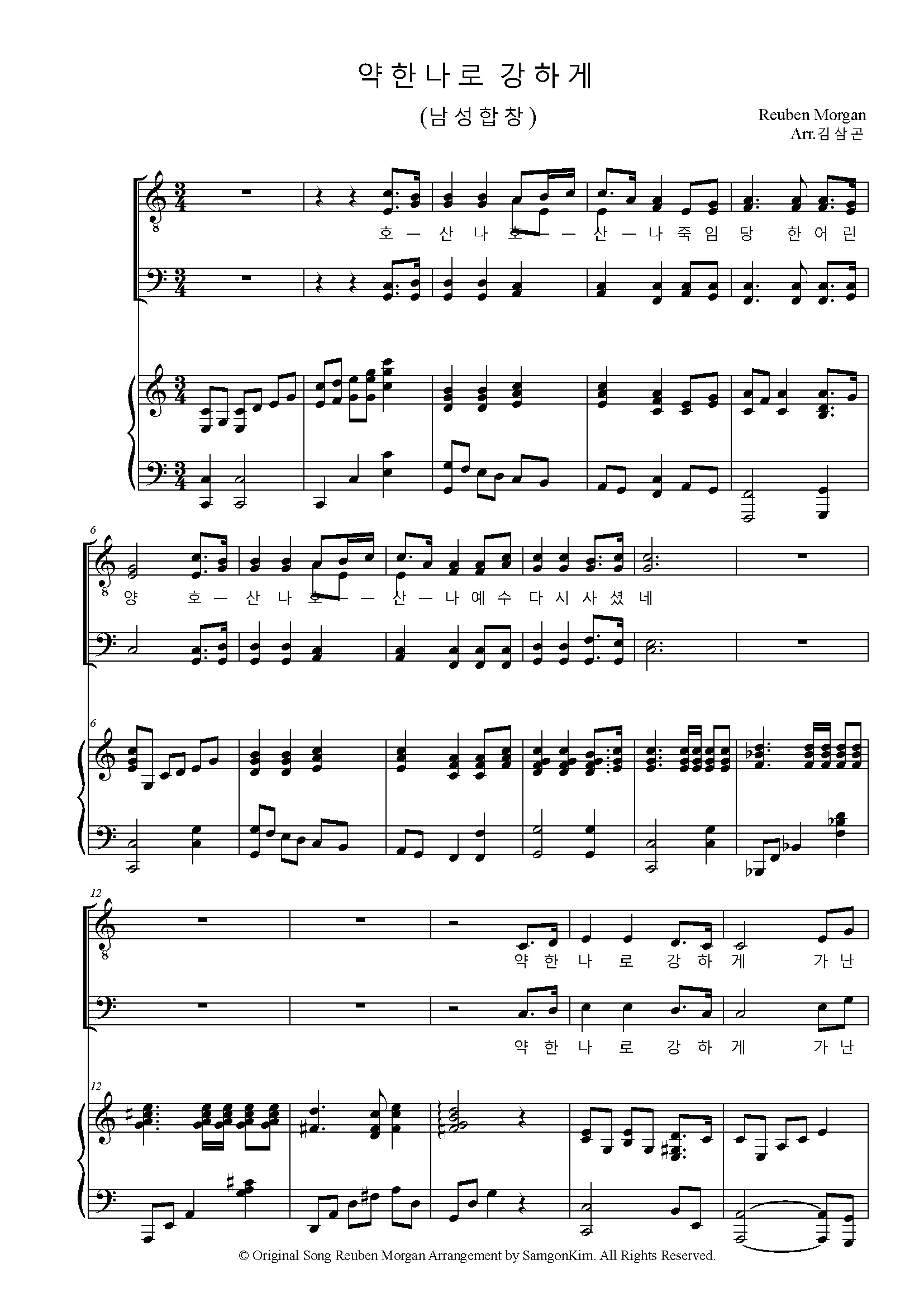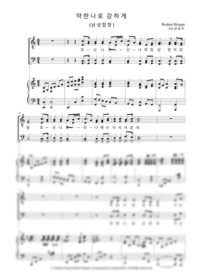 남성 합창으로 편곡된 이 곡은 원 곡의 웅장함과 감동을 더욱 깊게 느낄 수 있으며,. 남성들의 힘찬 목소리는 하나님의 강하심을 더욱 강조하며, 듣는 이들에게 용기와 힘을 실어 주리라 확신합니다.