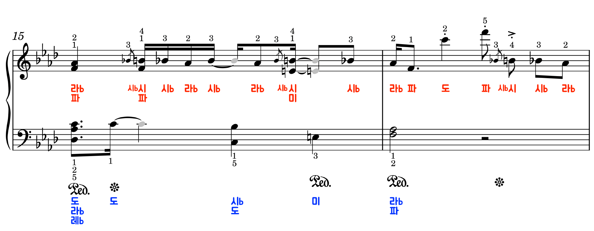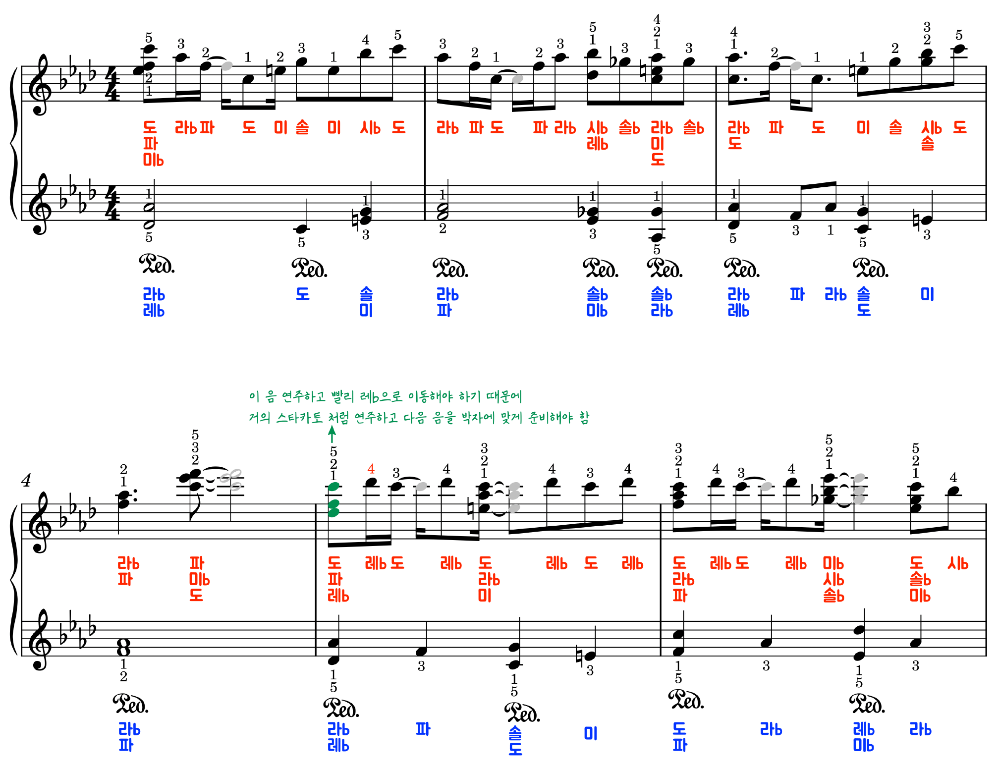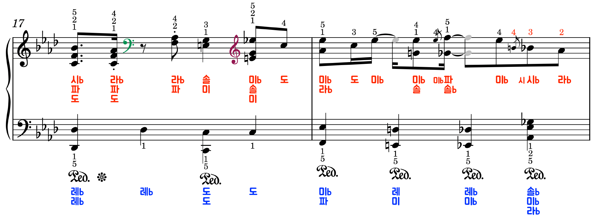 계이름, 손번호, 페달이 모두 적혀있는