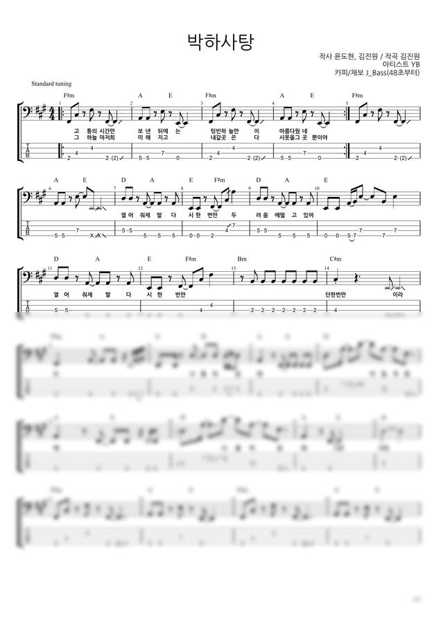 YB(윤도현 밴드)의 “박하사탕“ 베이스기타 악보입니다.