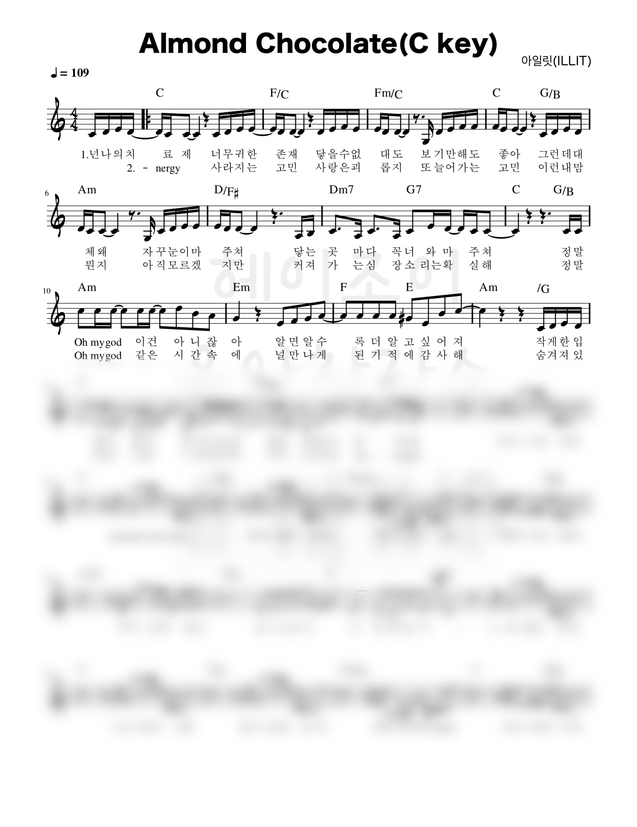 ILLIT(아일릿) - 아몬드초콜릿(Almond Chocolate) 다장조(Ckey)멜로디악보 by 헤이조이 2p 미리보기