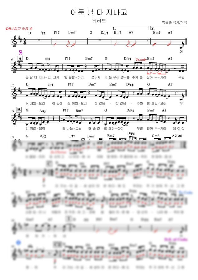 메인 보컬 멜로디와 함께 전주, 간주, 후주 멜로디와 화음이 표시 되어 있습니다.