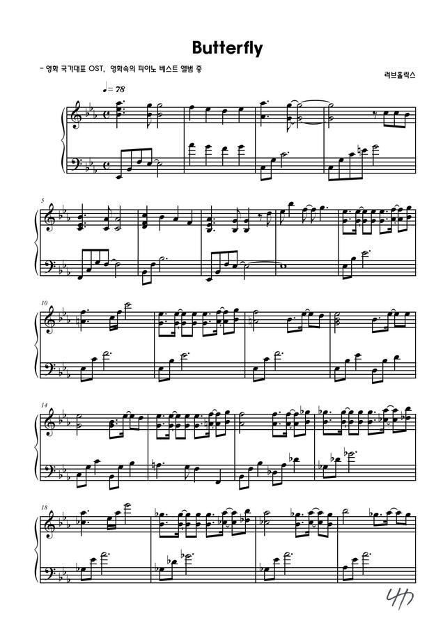 영화 국가대표의 OST 중 Butterfly라는 곡의 피아노 버전 악보입니다.