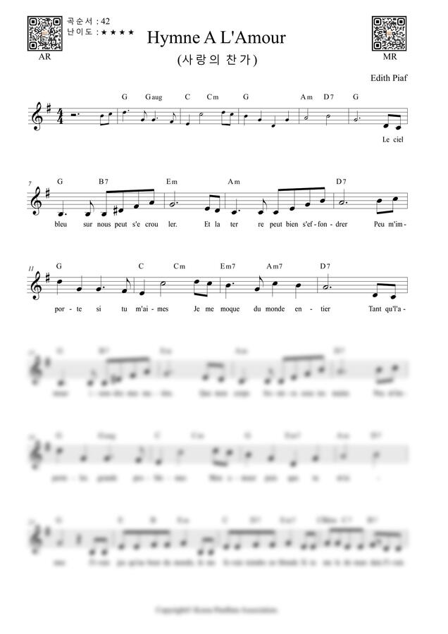 Edith Piaf - Hymne A L'Amour(사랑의 찬가) (팬플루트 악보 G) by 팬플뮤직 1p 미리보기