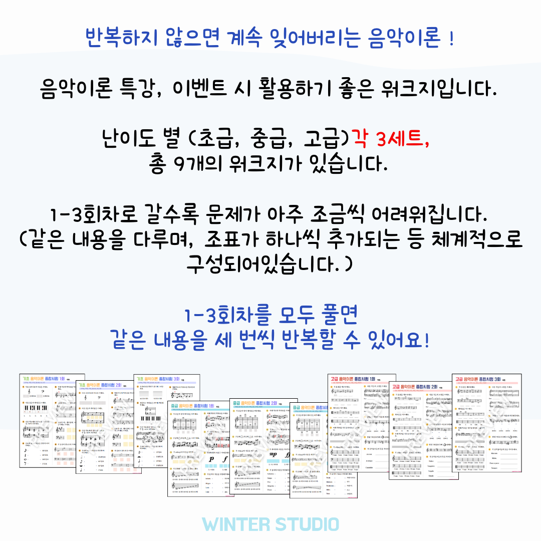 수업 준비 시간 절약, 바로 사용 가능한, 한 번 구입으로 평생 활용하는 음악 워크지, 겨울스튜디오입니다.
