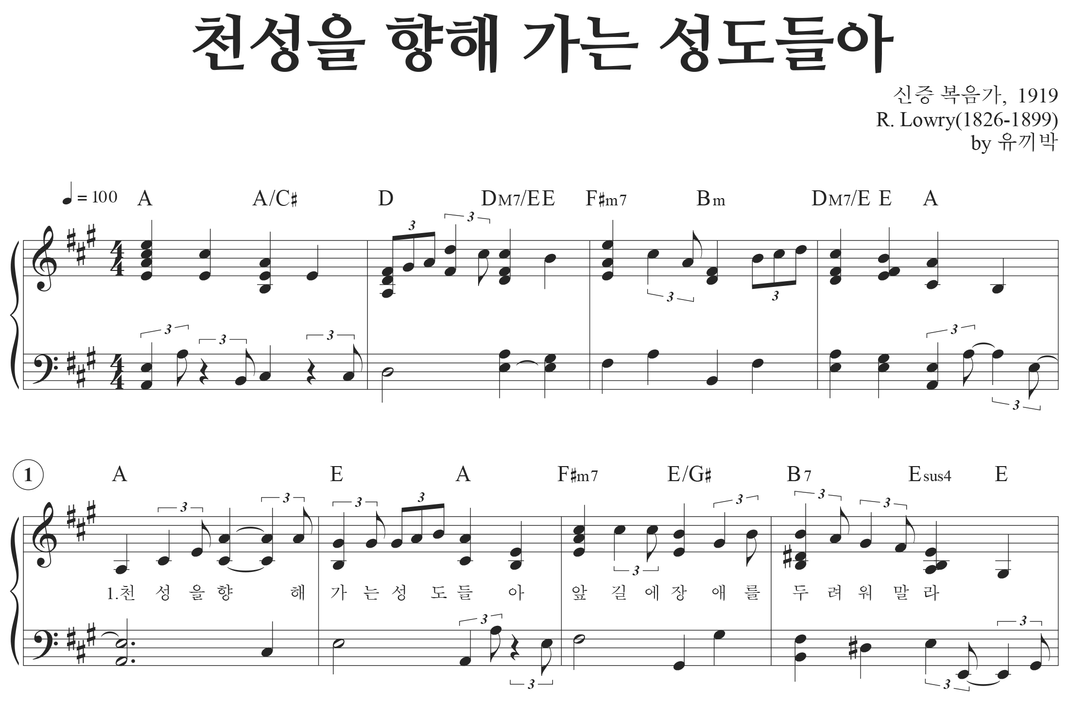 새찬송가 359장 '천성을 향해 가는 성도들아' 입니다.16분음표의 리듬들이 있어서 펑키하게 할 수도 있을 것 같은데요.셔플 리듬으로 해 봤습니다.밴드로 찬양할 수 있는 코드로 편곡을 해 봤습니다.