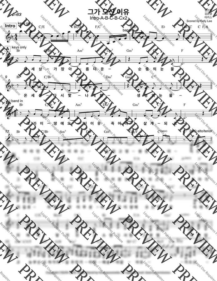 그가 오신 이유 마커스 F키 음원 그대로 화음도 포함된 밴드 채보 악보입니다.