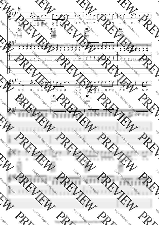 프리미엄 악보는 오선, 타브, 코드, 운지 등 생략된 기보없이 모든 정보를 다 보여주며, 코드는 악보내에 배치하고 다이어그램의 크기도 키워 직관성을 높이고, 보표단의 간격은 넓히는 등 연주자의 가시성과 편리성을 최대한 높힌 고급 악보입니다.