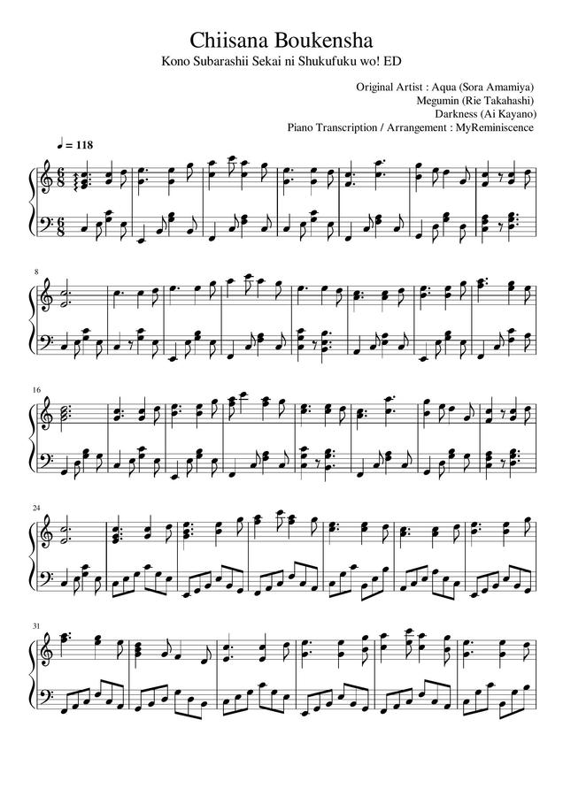 안녕하세요?제가 이번에 올릴곡은 이 멋진 세계에 축복을 바로 코노스바 1기의 엔딩곡인 작은 모험가란 곡입니다. 난이도는 매우 쉽습니다.