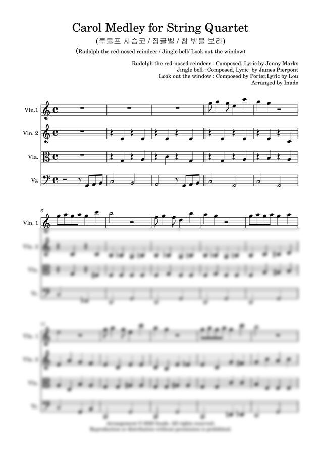캐롤 메들리 - 크리스마스 캐롤 메들리 for string Quartet (바이올린1/2, 비올라, 첼로) by Inado1