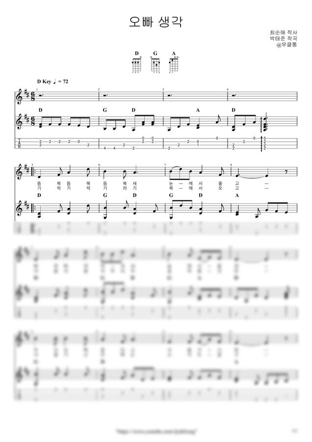 |우클통|의 악보는 오선+타브+가사+운지+코드 등을 잘 기록하고 있습니다.