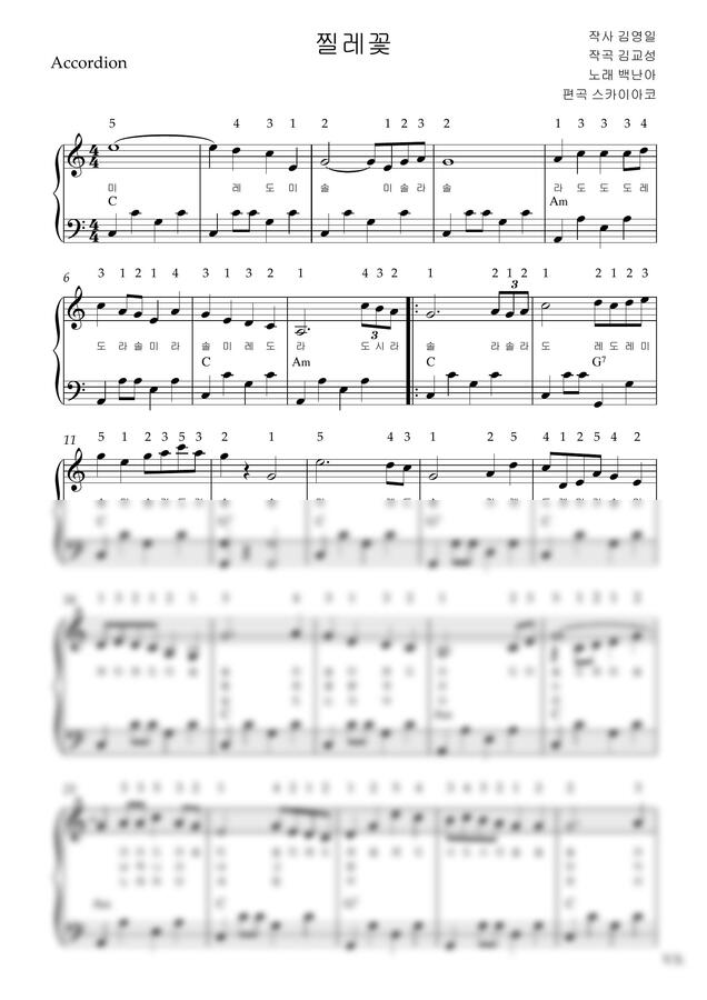 백난아 - 찔레꽃 (아코디언악보, 난이도 중상, 계이름, 손가락번호) by 스카이아코