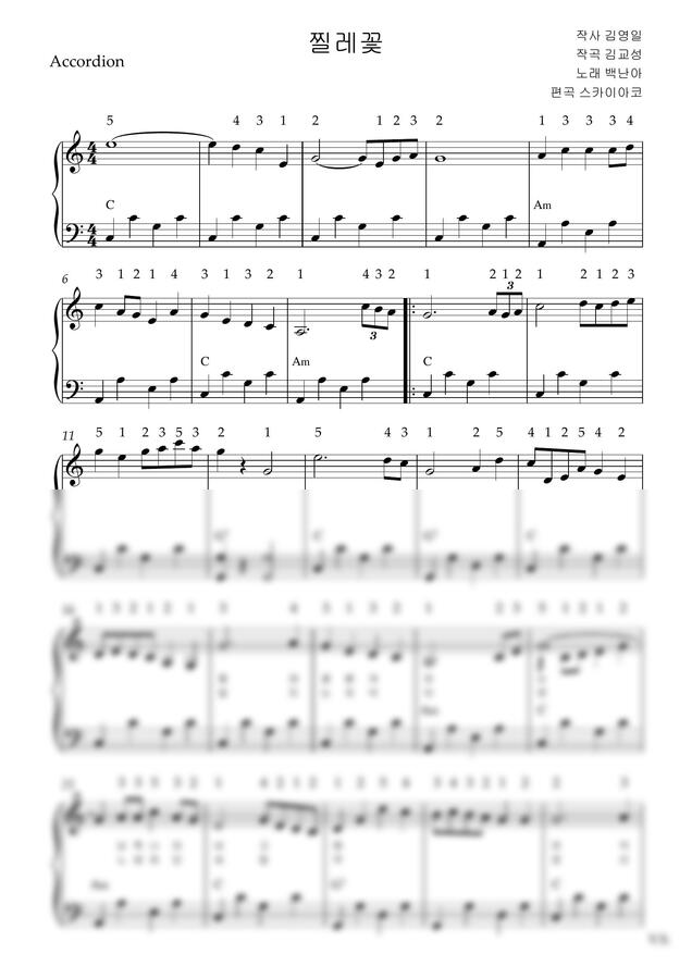 백난아 - 찔레꽃 (아코디언악보, 난이도 중급, 손가락번호) by 스카이아코