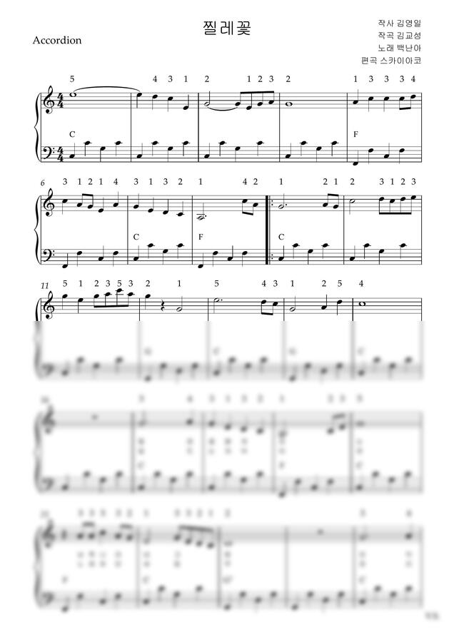 백난아 - 찔레꽃 (아코디언악보, 난이도 초급, 손가락번호) by 스카이아코