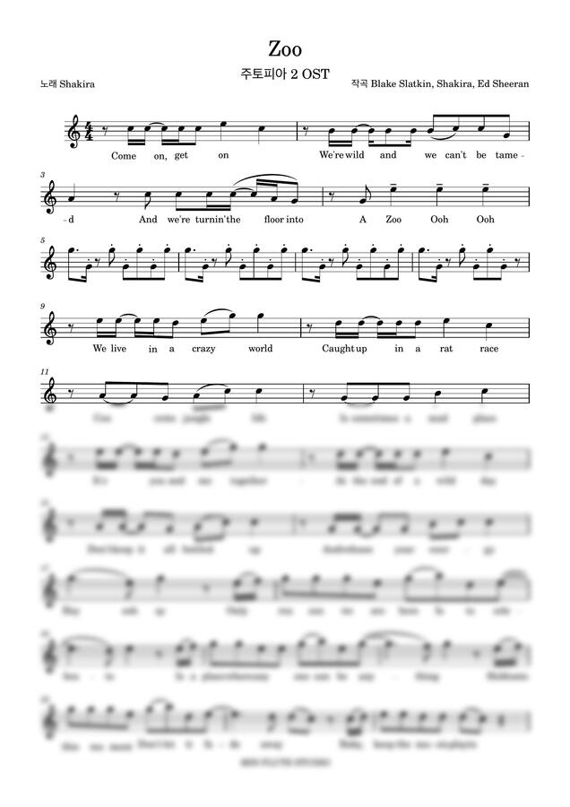 주토피아2를 관람하고 OST를 좋아하는 아이들을 위해 제작한 악보입니다.