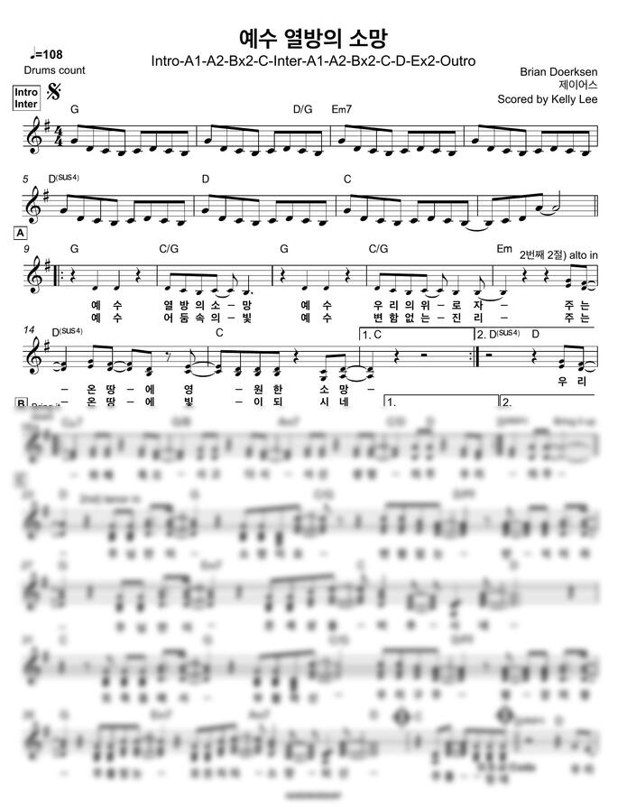 예수 열방의 소망 제이어스 음원 그대로 화음도 포함된 밴드 채보 악보입니다.