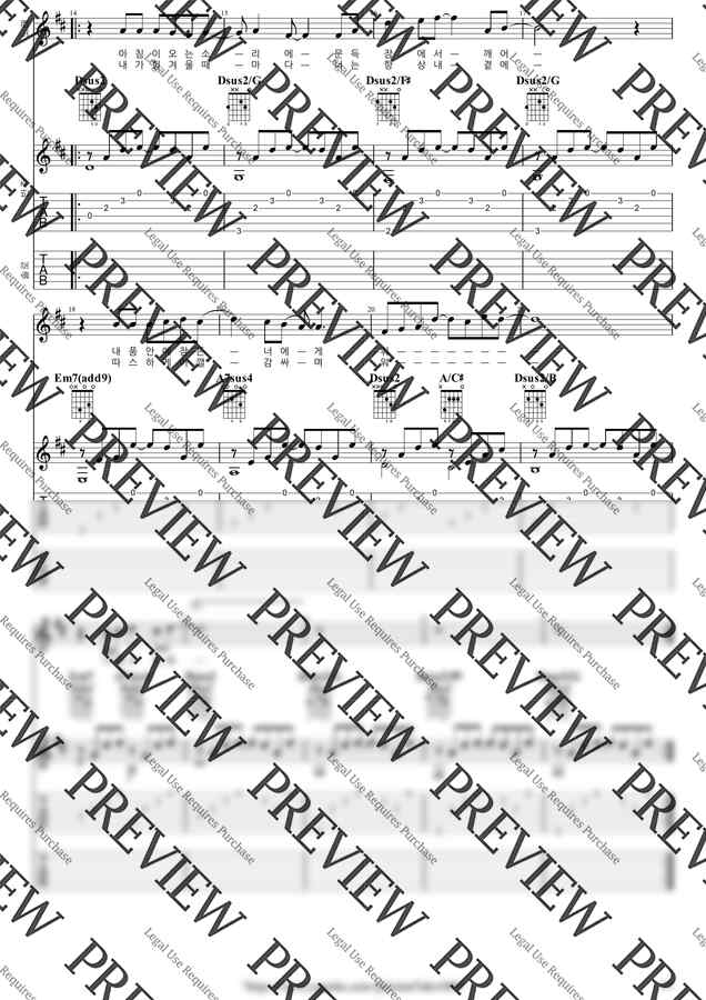 프리미엄 악보는 오선, 타브, 코드, 운지 등 생략된 기보없이 모든 정보를 다 보여주며, 코드는 악보내에 배치하고 다이어그램의 크기도 키워 직관성을 높이고, 보표단의 간격은 넓히는 등 연주자의 가시성과 편리성을 최대한 높힌 고급 악보입니다.