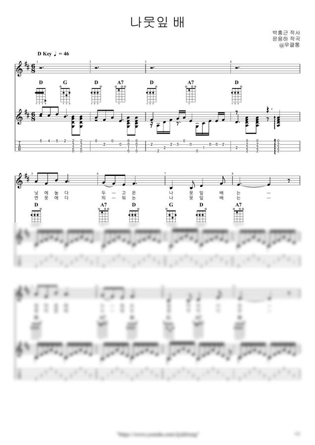 |우클통|의 악보는 오선+타브+가사+운지+코드 등을 잘 기록하고 있습니다.